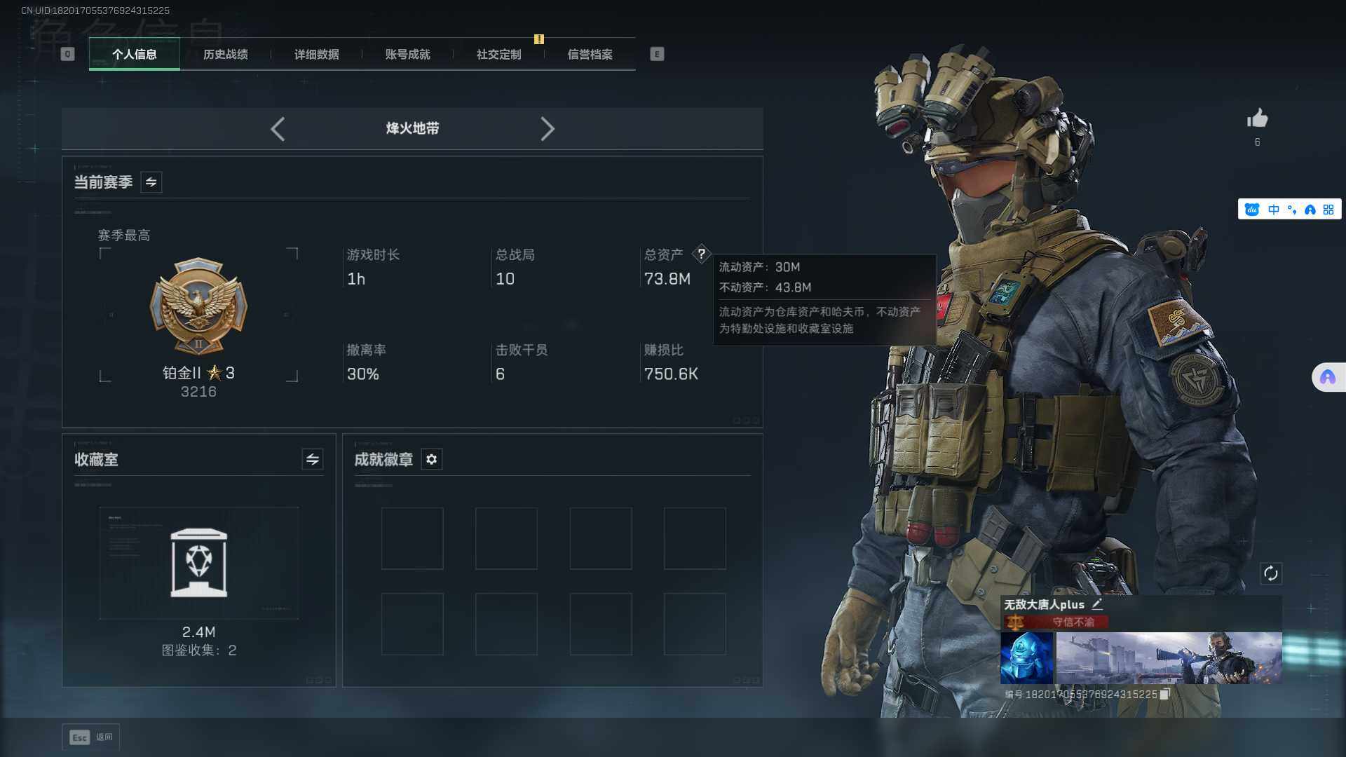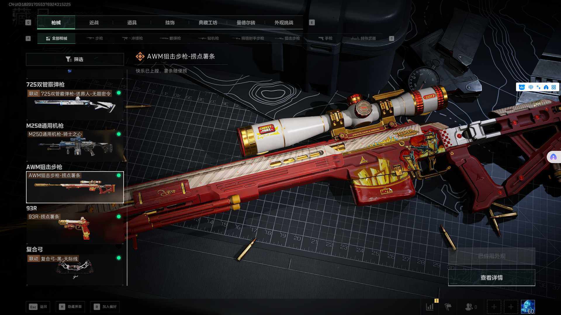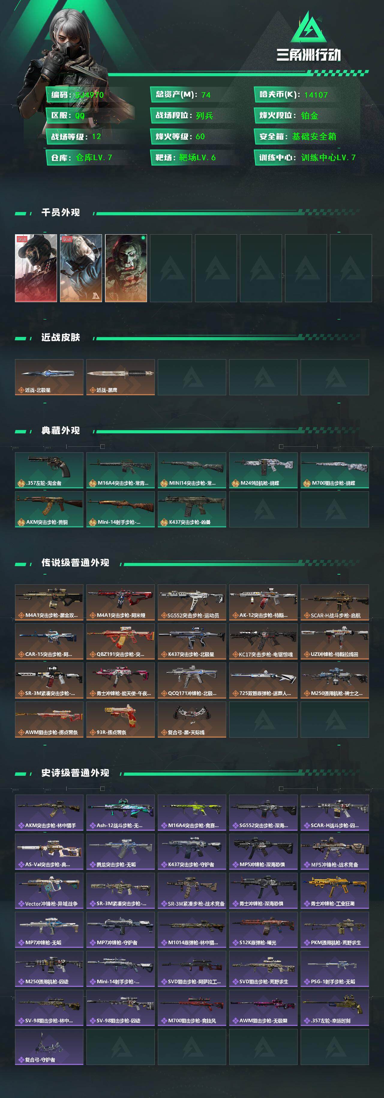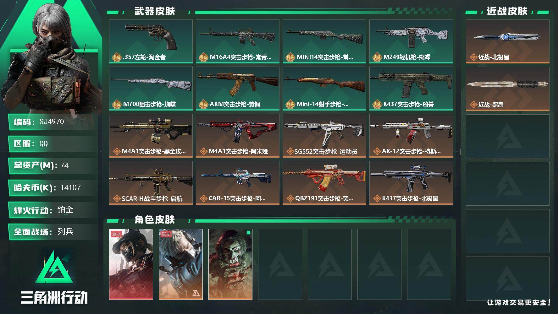 【SJ4970】总资产(M):74M/哈夫币(K):14107K/哈夫币(K):14107K/传说枪皮数:19/全面战场等级:12_段位:列兵/烽火地带等级:60_段位:铂金/露娜-黑·天际线/送葬人·无题密令/红狼-电锯惊魂/北极星/黑鹰/357左轮-淘金者/M16A4突击步枪-常青藤/Mini-14射手步枪-常青藤/M249轻机枪-蝴蝶/M700狙击步枪-蝴蝶/AKM突击步枪-黄铜/Mini-14射手步枪-黄铜/K437突击步枪-凶兽/M4A1突击步枪-蚀金玫瑰/M4A1突击步枪-阿米娅/SG552突击步枪-运动员/AK-12突击步枪-特斯拉线圈/SCAR-H战斗步枪-启航/CAR-15突击步枪-阿米娅/腾龙突击步枪-捞点薯条/K437突击步枪-北极星/KC17突击步枪-电锯惊魂/UZI冲锋枪-特斯拉线圈/SR-3M紧凑突击步枪-特斯拉线圈/勇士冲锋枪-能天使-午夜邮差/QCQ171冲锋枪-北极星/725双管霰弹枪-送葬人-无题密令/M250通用机枪-骑士之心/AWM狙击步枪-捞点薯条/93R-捞点薯条/复合弓·黑-天际线/AKM突击步枪林中猎手/ASh-12战斗步枪-无极限/M16A4突击步枪-竞赛选手/SG552突击步枪深海恐惧/SCAR-H战斗步枪-囚徒/AS Val突击步枪-典狱官/腾龙突击步枪-无垢/K437突击步枪-守护者/MP5冲锋枪深海恐惧/MP5冲锋枪-战术竞备/Vector冲锋枪-异域战争/SR-3M紧凑突击步枪-荒野求生/SR-3M紧凑突击步枪-战术竞备/勇士冲锋枪深海恐惧/勇士冲锋枪-工业狂潮/MP7冲锋枪-无垢/MP7冲锋枪-守护者/M1014霰弹枪-林中猎手/S12K霰弹枪-曙光/PKM通用机枪-荒野求生/M250通用机枪-囚徒/Mini-14射手步枪-守护者/SVD狙击步枪-阿萨拉工艺/SVD狙击步枪-荒野求生/PSG-1射手步枪-无垢/SV-98狙击步枪-林中猎手/SV-98狙击步枪-囚徒/M700狙击步枪-竞技风/AWM狙击步枪-无极限/357左轮-幸运时刻/复合弓-守护者/K416突击步枪-虎啸/SCAR-H战斗步枪-荣耀列队/PTR-32突击步枪-天网/腾龙突击步枪-雪崩/腾龙突击步枪-前沿科技/K437突击步枪-天狼星/MP5冲锋枪-弄臣/MP5冲锋枪-虎啸/Vector冲锋枪-先锋/UZI冲锋枪-前沿科技/SMG-45-行动开启/SMG-45冲锋枪-幻影结构/SMG-45冲锋枪-天网/SR-3M紧凑突击步枪-雪崩/M1014霰弹枪-幻影结构/M250通用机枪-虎啸/M250通用机枪-天网/Mini-14射手步枪-荣耀列队/SKS射手步枪-弄臣/SKS射手步枪-雪崩/SR-25射手步枪-开拓/SR-9射手步枪-街头涂鸦/SV-98狙击步枪-星链科技/G18-星链科技/M4A1突击步枪-粉色涂装/M4A1突击步枪-高雅黑/M4A1突击步枪-海色/AKM突击步枪-彩墨喷涂/QBZ95-1突击步枪-高雅黑/QBZ95-1突击步枪-海浪/QBZ95-1突击步枪-海色/K416突击步枪-几何迷彩/K416突击步枪-高雅黑/M16A4突击步枪-山林猎人/AUG突击步枪-浅蓝涂装/M7战斗步枪-红色涂装/SG552突击步枪-浅蓝涂装/SG552突击步枪-海浪/SG552突击步枪-彩墨喷涂/AK-12突击步枪-落花/SCAR-H战斗步枪-数码迷彩/G3战斗步枪-高雅黑/G3战斗步枪-山林猎人/PTR-32突击步枪-黄蜂/腾龙突击步枪-彩墨喷涂/MP5冲锋枪-海色/MP5冲锋枪-黄蜂/Vector冲锋枪-几何迷彩/UZI冲锋枪-海色/UZI冲锋枪-山林猎人/野牛冲锋枪-彩墨喷涂/M1014霰弹枪-高雅黑/M1014霰弹枪-海浪/PKM通用机枪-彩墨喷涂/M249轻机枪-黄蜂/QJB201轻机枪-山林猎人/Mini-14射手步枪-山林猎人/SR-25射手步枪-黄蜂/SV-98狙击步枪-红色涂装/M700狙击步枪-山林猎人/沙漠之鹰-海浪/M1911-坚固材料/军牌-北极星/军牌-飞驰/军牌-夏日派对/军牌-捞点薯条/军牌-特斯拉线圈/军牌-失重/军牌-送葬人·无题密令/军牌-猫咪/军牌-装备修理/军牌-静谧时光/军牌-享受音乐/军牌-永恒/军牌-零号大坝/军牌-肥柴集合/军牌-来点薯条/军牌-修整/军牌-神秘艺术/军牌-信誉优秀/军牌-下午茶/军牌-小心鳄鱼/挂饰-阿萨拉盾兵/挂饰-麦小鼠/挂饰-北极星/挂饰-黑/挂饰-阿萨拉狙击兵/挂饰-阿萨拉霰弹兵/挂饰-诡影狙击兵/挂饰-诡影喷火兵/挂饰-特斯拉线圈/挂饰-来点薯条/挂饰-晶石幻想/挂饰-彩蛋/挂饰-启程/挂饰-阿萨拉徽章