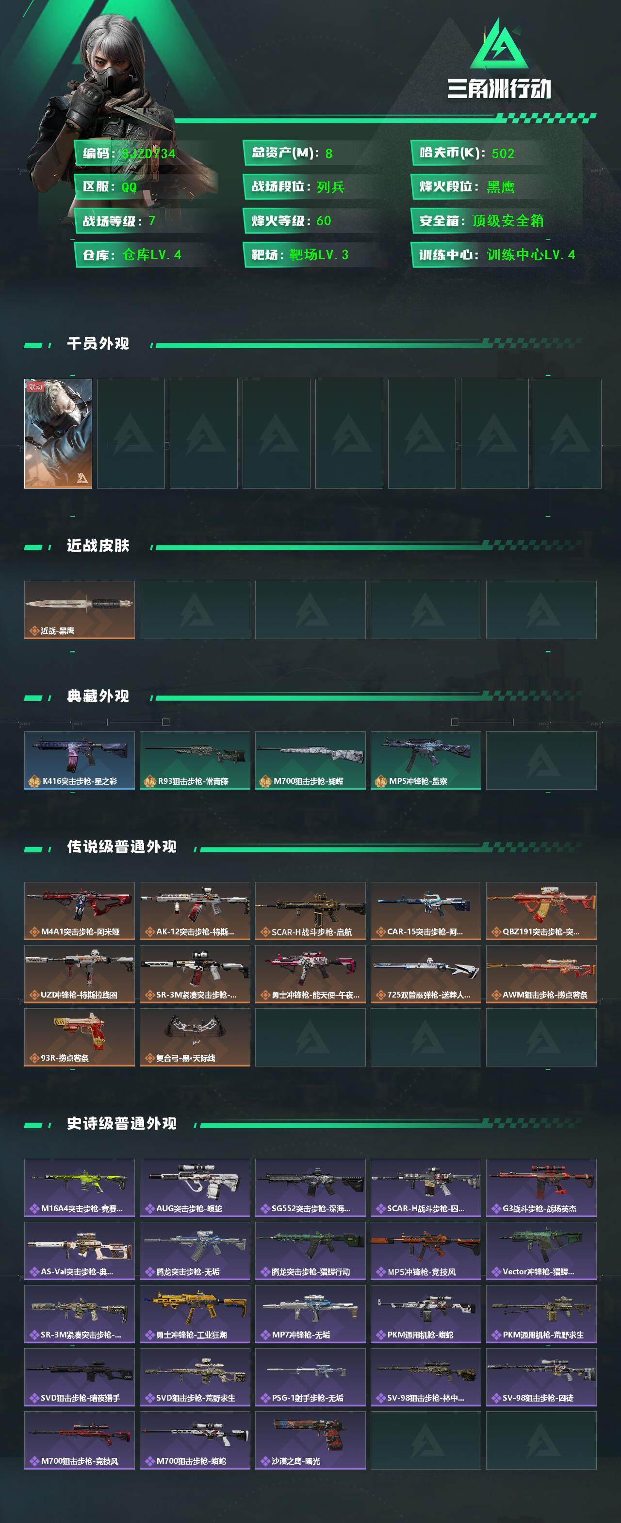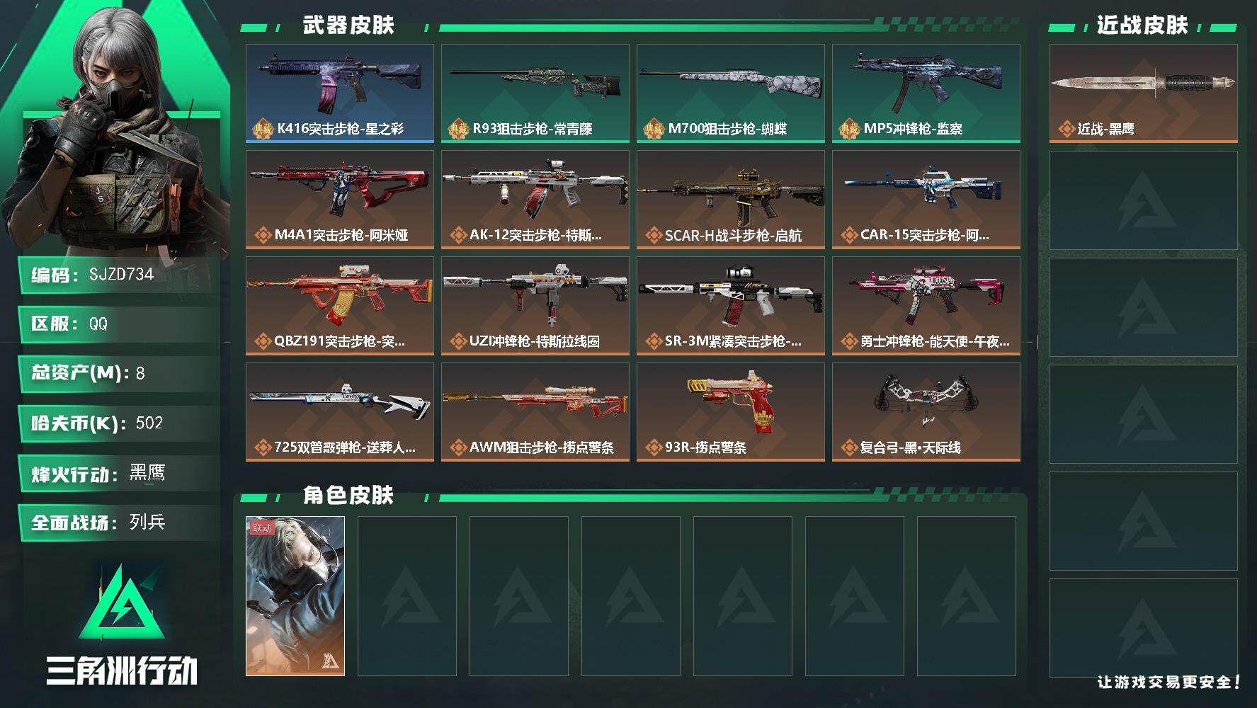 【SJZD734】总资产(M):8M/哈夫币(K):502K/哈夫币(K):502K/传说枪皮数:8/全面战场等级:7_段位:列兵/烽火地带等级:60_段位:黑鹰/送葬人·无题密令/黑鹰/K416突击步枪-星之彩/R93狙击步枪-常青藤/M700狙击步枪-蝴蝶/MP5冲锋枪-监察/M4A1突击步枪-阿米娅/AK-12突击步枪-特斯拉线圈/SCAR-H战斗步枪-启航/CAR-15突击步枪-阿米娅/腾龙突击步枪-捞点薯条/UZI冲锋枪-特斯拉线圈/SR-3M紧凑突击步枪-特斯拉线圈/勇士冲锋枪-能天使-午夜邮差/725双管霰弹枪-送葬人-无题密令/AWM狙击步枪-捞点薯条/93R-捞点薯条/复合弓·黑-天际线/M16A4突击步枪-竞赛选手/AUG突击步枪-蝮蛇/SG552突击步枪深海恐惧/SCAR-H战斗步枪-囚徒/G3战斗步枪-战场英杰/AS Val突击步枪-典狱官/腾龙突击步枪-无垢/腾龙突击步枪-猎鳄行动/MP5冲锋枪-竞技风/Vector冲锋枪-猎鳄行动/SR-3M紧凑突击步枪-荒野求生/勇士冲锋枪-工业狂潮/MP7冲锋枪-无垢/PKM通用机枪-蝮蛇/PKM通用机枪-荒野求生/SVD狙击步枪暗夜猎手/SVD狙击步枪-荒野求生/PSG-1射手步枪-无垢/SV-98狙击步枪-林中猎手/SV-98狙击步枪-囚徒/M700狙击步枪-竞技风/M700狙击步枪-蝮蛇/沙漠之鹰-曙光/K416突击步枪-街头涂鸦/K416突击步枪-虎啸/SCAR-H战斗步枪-荣耀列队/PTR-32突击步枪-天网/腾龙突击步枪-雪崩/K437突击步枪-天狼星/MP5冲锋枪-弄臣/MP5冲锋枪-虎啸/P90冲锋枪-浅鲨小队/Vector冲锋枪-先锋/VECTOR冲锋枪-街头涂鸦/SMG-45-行动开启/SMG-45冲锋枪-幻影结构/SR-3M紧凑突击步枪-雪崩/M1014霰弹枪-幻影结构/PKM通用机枪-英雄/M249轻机枪-毛鲁斯之力/M250通用机枪-前沿科技/M250通用机枪-虎啸/Mini-14射手步枪-荣耀列队/SKS射手步枪-弄臣/SKS射手步枪-雪崩/SR-25射手步枪-开拓/SR-9射手步枪-街头涂鸦/SV-98狙击步枪-星链科技/G18-星链科技/M4A1突击步枪-粉色涂装/M4A1突击步枪-高雅黑/M4A1突击步枪-海色/AKM突击步枪-彩墨喷涂/QBZ95-1突击步枪-高雅黑/QBZ95-1突击步枪-海浪/QBZ95-1突击步枪-三角洲力量/QBZ95-1突击步枪-海色/K416突击步枪-几何迷彩/K416突击步枪-高雅黑/M16A4突击步枪-山林猎人/AUG突击步枪-浅蓝涂装/M7战斗步枪-红色涂装/SG552突击步枪-浅蓝涂装/SG552突击步枪-海浪/SG552突击步枪-彩墨喷涂/AK-12突击步枪-冰川/SCAR-H战斗步枪-数码迷彩/G3战斗步枪-高雅黑/G3战斗步枪-山林猎人/PTR-32突击步枪-黄蜂/腾龙突击步枪-彩墨喷涂/MP5冲锋枪-安全工作/MP5冲锋枪-海色/MP5冲锋枪-黄蜂/P90冲锋枪-安全工作/Vector冲锋枪-几何迷彩/UZI冲锋枪-海色/UZI冲锋枪-山林猎人/野牛冲锋枪-彩墨喷涂/QCQ171冲锋枪-三角洲力量/M1014霰弹枪-高雅黑/M1014霰弹枪-海浪/PKM通用机枪-彩墨喷涂/M249轻机枪-黄蜂/QJB201轻机枪-三角洲力量/QJB201轻机枪-山林猎人/Mini-14射手步枪-山林猎人/SKS射手步枪-三角洲力量/SR-25射手步枪-黄蜂/SV-98狙击步枪-红色涂装/M700狙击步枪-山林猎人/.357左轮-精钢/沙漠之鹰-海浪/M1911-坚固材料/军牌-捞点薯条/军牌-特斯拉线圈/军牌-失重/军牌-送葬人·无题密令/军牌-静谧时光/军牌-展示/军牌-享受音乐/军牌-永恒/军牌-零号大坝/军牌-来点薯条/军牌-修整/军牌-神秘艺术/军牌-信誉优秀/军牌-下午茶/军牌-小心鳄鱼/挂饰-阿萨拉机枪兵/挂饰-黑/挂饰-诡影狙击兵/挂饰-诡影喷火兵/挂饰-暗行哨兵/挂饰-特斯拉线圈/挂饰-来点薯条/挂饰-晶石幻想/挂饰-启程