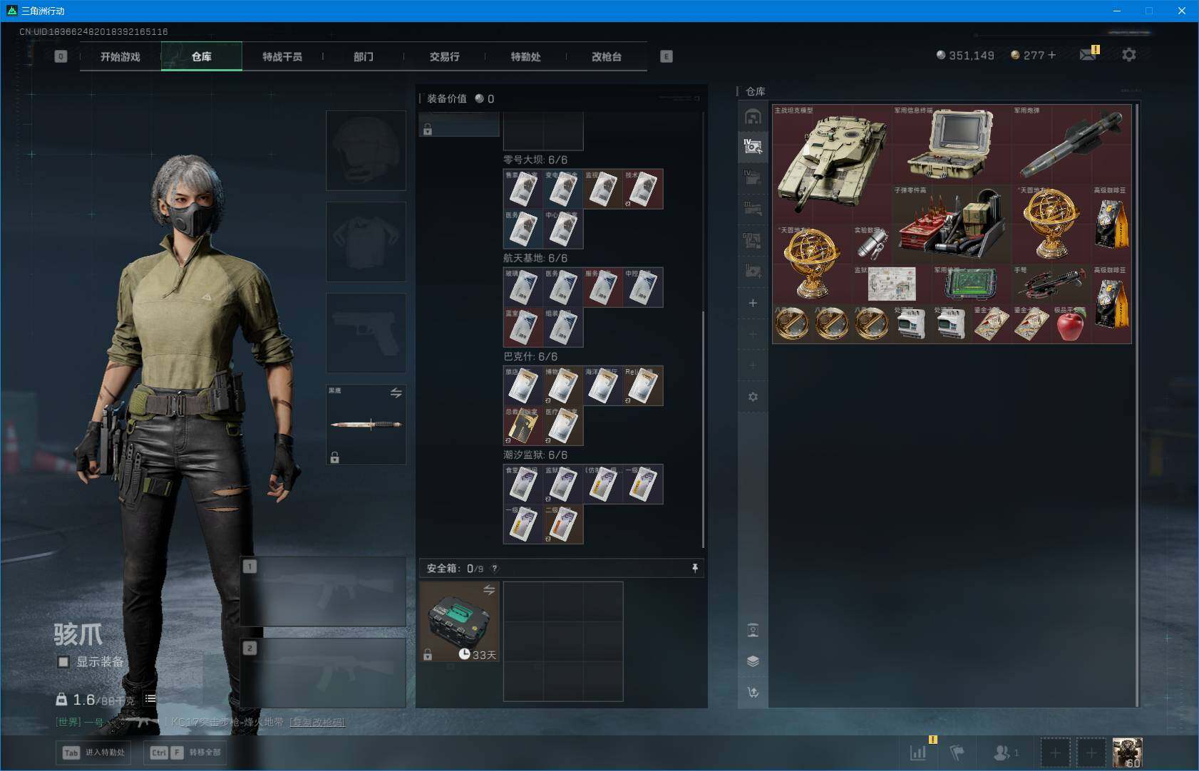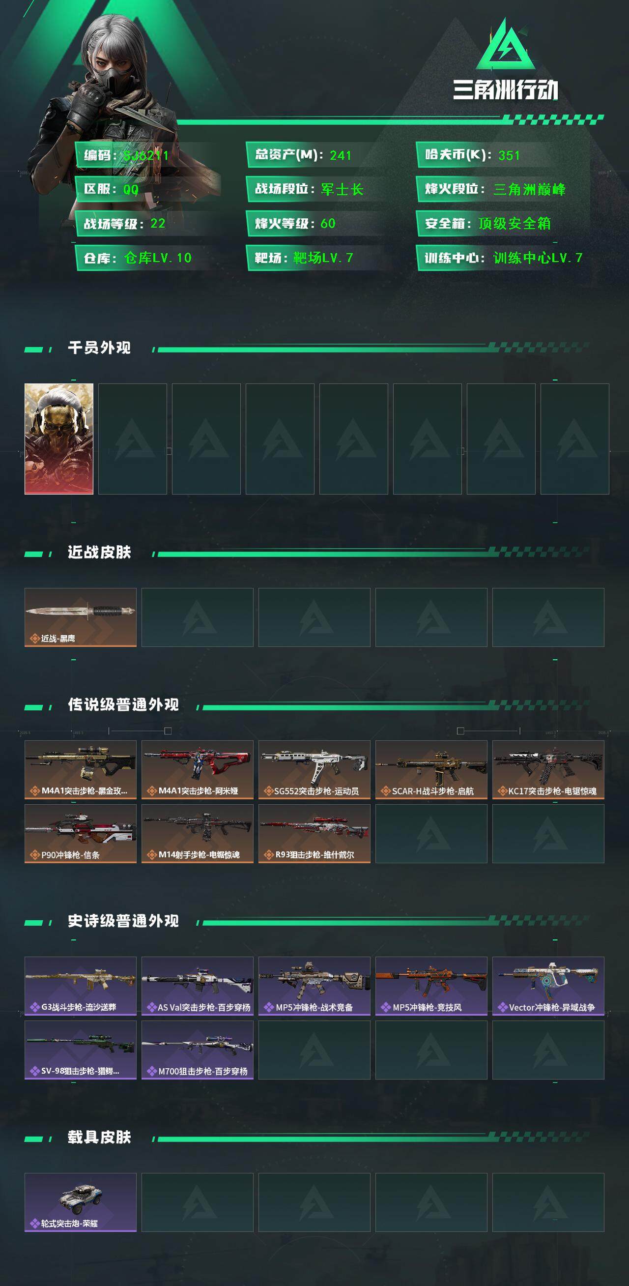 【SJ6211】总资产(M):241M/哈夫币(K):351K/哈夫币(K):351K/全面战场等级:22_段位:军士长/烽火地带等级:60_段位:三角洲巅峰/蚀金玫瑰/黑鹰/M4A1突击步枪-蚀金玫瑰/M4A1突击步枪-阿米娅/SG552突击步枪-运动员/SCAR-H战斗步枪-启航/KC17突击步枪-电锯惊魂/P90冲锋枪-信条/M14射手步枪-电锯惊魂/R93狙击步枪-维什戴尔/G3战斗步枪-流沙送葬/AS Val突击步枪-百步穿杨/MP5冲锋枪-战术竞备/MP5冲锋枪-竞技风/Vector冲锋枪-异域战争/SV-98狙击步枪-猎鳄行动/M700狙击步枪-百步穿杨/M1014霰弹枪-花岗岩/M4A1突击步枪-繁盛/AKM突击步枪-肃杀/QBZ95-1突击步枪-公平竞技/ASh-12战斗步枪-繁盛/M7战斗步枪-精英联盟/M7战斗步枪-捣蛋鬼/MP5冲锋枪-哈夫克卫队/Vector冲锋枪-先锋/SMG-45-行动开启/勇士冲锋枪-主宰/SR-25射手步枪-开拓/SR9射手步枪-肃杀/S12K霰弹枪-监察/R93狙击步枪-猛兽/M1014霰弹枪-旧工业/M4A1突击步枪-高雅黑/M4A1突击步枪-海色/QBZ95-1突击步枪-高雅黑/K416突击步枪-高雅黑/M16A4突击步枪-高雅黑/AUG突击步枪-浅蓝涂装/M7战斗步枪-红色涂装/SG552突击步枪-三角洲力量/SG552突击步枪-浅蓝涂装/SG552突击步枪-海浪/AK-12突击步枪-变色龙/CAR-15突击步枪-变色龙/MP5冲锋枪-海色/MP5冲锋枪-黄蜂/Vector冲锋枪-几何迷彩/UZI冲锋枪-海色/野牛冲锋枪-高雅黑/SR-3M紧凑突击步枪-变色龙/M1014霰弹枪-高雅黑/M1014霰弹枪-海浪/M1014霰弹枪-变色龙/M250通用机枪-条纹/QJB201轻机枪-磐石/SKS射手步枪-三角洲力量/SR-25射手步枪-黄蜂/SR9射手步枪-磐石/SV-98狙击步枪-红色涂装/R93狙击步枪-变色龙/QSZ92G-条纹/沙漠之鹰-海浪/沙漠之鹰-高雅黑/轮式突击炮-荣耀/军牌-来点薯条/军牌-神秘艺术/军牌-信誉优秀/军牌-小心鳄鱼/挂饰-麦小鼠/挂饰-维什戴尔/挂饰-蚀金玫瑰/挂饰-诡影狙击兵/挂饰-诡影喷火兵/挂饰-崩岩重炮/挂饰-暗行哨兵/挂饰-启程