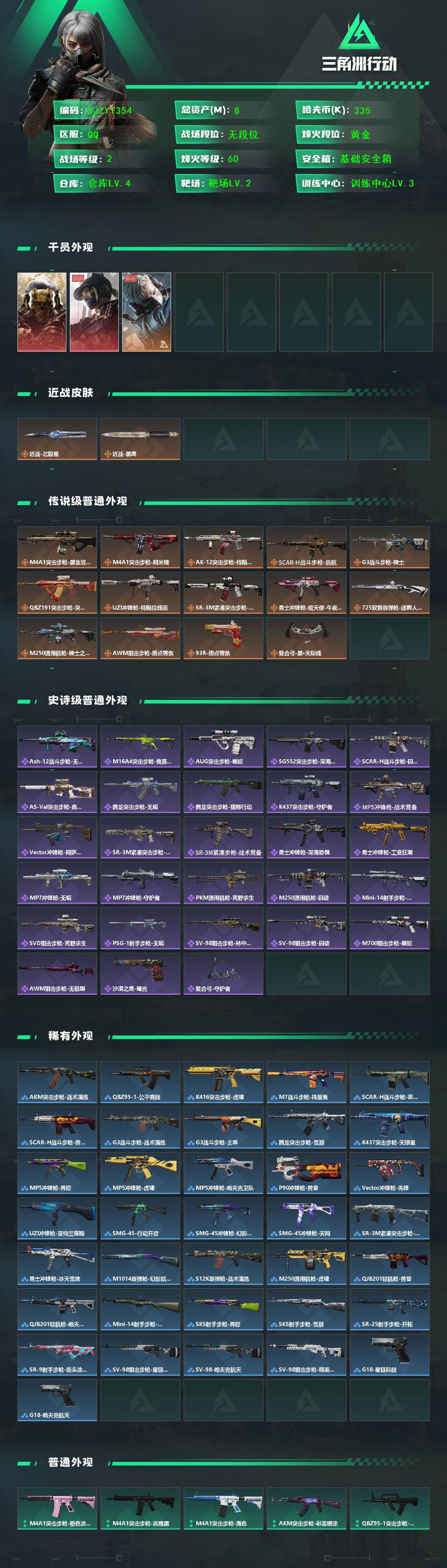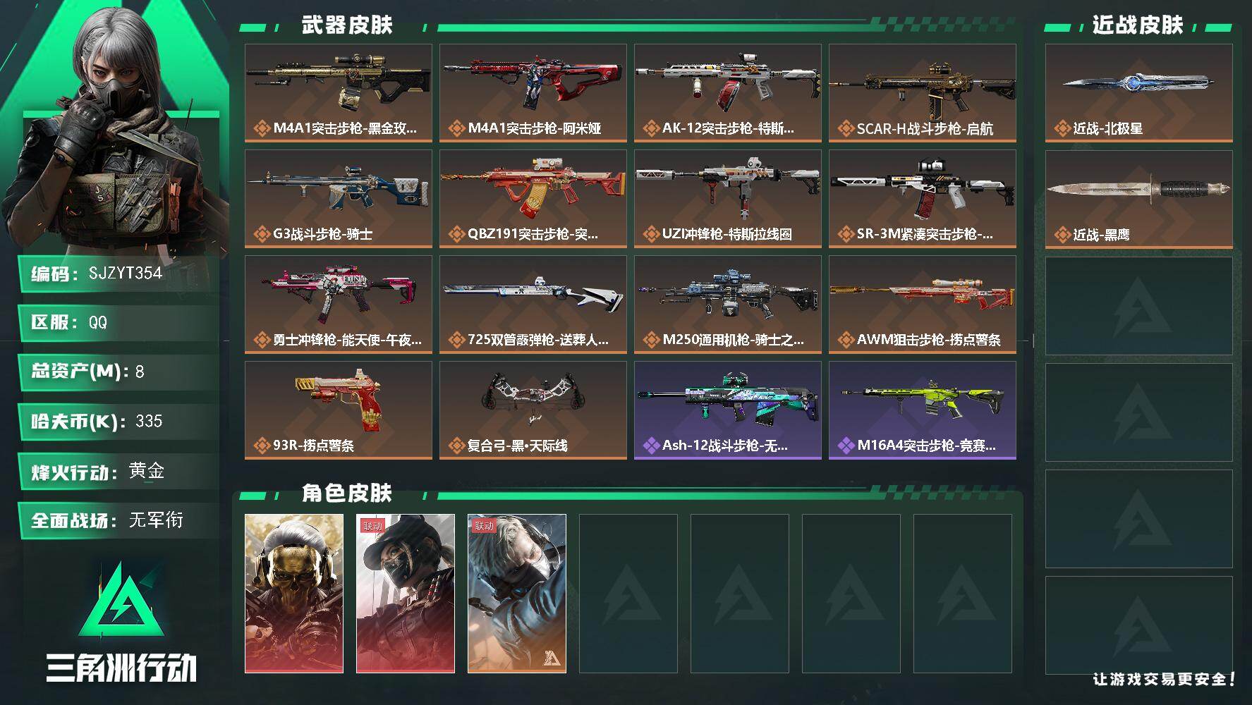 【SJZYT354】总资产(M):8M/哈夫币(K):335K/哈夫币(K):335K/传说枪皮数:14/全面战场等级:2_段位:无段位/烽火地带等级:60_段位:黄金/红狼-蚀金玫瑰/露娜-黑·天际线/送葬人·无题密令/北极星/黑鹰/M4A1突击步枪-蚀金玫瑰/M4A1突击步枪-阿米娅/AK-12突击步枪-特斯拉线圈/SCAR-H战斗步枪-启航/G3战斗步枪-骑士/腾龙突击步枪-捞点薯条/UZI冲锋枪-特斯拉线圈/SR-3M紧凑突击步枪-特斯拉线圈/勇士冲锋枪-能天使-午夜邮差/725双管霰弹枪-送葬人-无题密令/M250通用机枪-骑士之心/AWM狙击步枪-捞点薯条/93R-捞点薯条/复合弓·黑-天际线/ASh-12战斗步枪-无极限/M16A4突击步枪-竞赛选手/AUG突击步枪-蝮蛇/SG552突击步枪深海恐惧/SCAR-H战斗步枪-囚徒/AS Val突击步枪-典狱官/腾龙突击步枪-无垢/腾龙突击步枪-猎鳄行动/K437突击步枪-守护者/MP5冲锋枪-战术竞备/Vector冲锋枪-阿萨拉文明/SR-3M紧凑突击步枪-荒野求生/SR-3M紧凑突击步枪-战术竞备/勇士冲锋枪深海恐惧/勇士冲锋枪-工业狂潮/MP7冲锋枪-无垢/MP7冲锋枪-守护者/PKM通用机枪-荒野求生/M250通用机枪-囚徒/Mini-14射手步枪-守护者/SVD狙击步枪-荒野求生/PSG-1射手步枪-无垢/SV-98狙击步枪-林中猎手/SV-98狙击步枪-囚徒/M700狙击步枪-蝮蛇/AWM狙击步枪-无极限/沙漠之鹰-曙光/复合弓-守护者/AKM突击步枪-战术演练/QBZ95-1突击步枪-公平竞技/K416突击步枪-虎啸/M7战斗步枪-捣蛋鬼/SCAR-H战斗步枪-荣耀列队/SCAR-H战斗步枪-黄昏/G3战斗步枪-战术演练/G3战斗步枪-主宰/腾龙突击步枪-雪崩/K437突击步枪-天狼星/MP5冲锋枪-弄臣/MP5冲锋枪-虎啸/MP5冲锋枪-哈夫克卫队/P90冲锋枪-黄昏/Vector冲锋枪-先锋/UZI冲锋枪-亚特兰蒂斯/SMG-45-行动开启/SMG-45冲锋枪-幻影结构/SMG-45冲锋枪-天网/SR-3M紧凑突击步枪-雪崩/勇士冲锋枪-冰天雪地/M1014霰弹枪-幻影结构/S12K霰弹枪-战术演练/M250通用机枪-虎啸/QJB201轻机枪-黄昏/QJB201轻机枪-哈夫克卫队/Mini-14射手步枪-荣耀列队/SKS射手步枪-弄臣/SKS射手步枪-雪崩/SR-25射手步枪-开拓/SR-9射手步枪-街头涂鸦/SV-98狙击步枪-星链科技/SV-98狙击步枪-哈夫克航天/SV-98狙击步枪-精英联盟/G18-星链科技/G18-哈夫克航天/M4A1突击步枪-粉色涂装/M4A1突击步枪-高雅黑/M4A1突击步枪-海色/AKM突击步枪-彩墨喷涂/QBZ95-1突击步枪-高雅黑/QBZ95-1突击步枪-海浪/QBZ95-1突击步枪-海色/QBZ95-1突击步枪-2026/K416突击步枪-几何迷彩/K416突击步枪-高雅黑/M16A4突击步枪-山林猎人/M16A4突击步枪-高雅黑/AUG突击步枪-浅蓝涂装/M7战斗步枪-红色涂装/SG552突击步枪-三角洲力量/SG552突击步枪-浅蓝涂装/SG552突击步枪-海浪/SG552突击步枪-彩墨喷涂/SCAR-H战斗步枪-数码迷彩/SCAR-H战斗步枪-电路图/G3战斗步枪-高雅黑/G3战斗步枪-山林猎人/PTR-32突击步枪-黄蜂/PTR-32突击步枪-条纹/CAR-15突击步枪-电路图/腾龙突击步枪-彩墨喷涂/MP5冲锋枪-海色/MP5冲锋枪-黄蜂/P90冲锋枪-电路图/Vector冲锋枪-几何迷彩/UZI冲锋枪-海色/UZI冲锋枪-山林猎人/野牛冲锋枪-彩墨喷涂/野牛冲锋枪-高雅黑/SMG-45冲锋枪-条纹/M1014霰弹枪-高雅黑/M1014霰弹枪-海浪/725双管霰弹枪-条纹/PKM通用机枪-彩墨喷涂/M249轻机枪-黄蜂/M250通用机枪-条纹/QJB201轻机枪-山林猎人/Mini-14射手步枪-山林猎人/SVD狙击步枪-高雅黑/SVD狙击步枪-电路图/SR-25射手步枪-黄蜂/SV-98狙击步枪-红色涂装/SV-98狙击步枪-条纹/M700狙击步枪-山林猎人/QSZ92G-电路图/QSZ92G-条纹/沙漠之鹰-海浪/沙漠之鹰-高雅黑/G17-2026/轮式突击炮-荣耀/挂饰-赤霄游龙/挂饰-蚀金玫瑰/挂饰-黑/挂饰-崩岩重炮/挂饰-暗行哨兵/挂饰-特斯拉线圈/挂饰-来点薯条/挂饰-晶石幻想/挂饰-启程/挂饰-龙门币/挂饰-阿米娅/挂饰-紧急撤离/挂饰-麻将