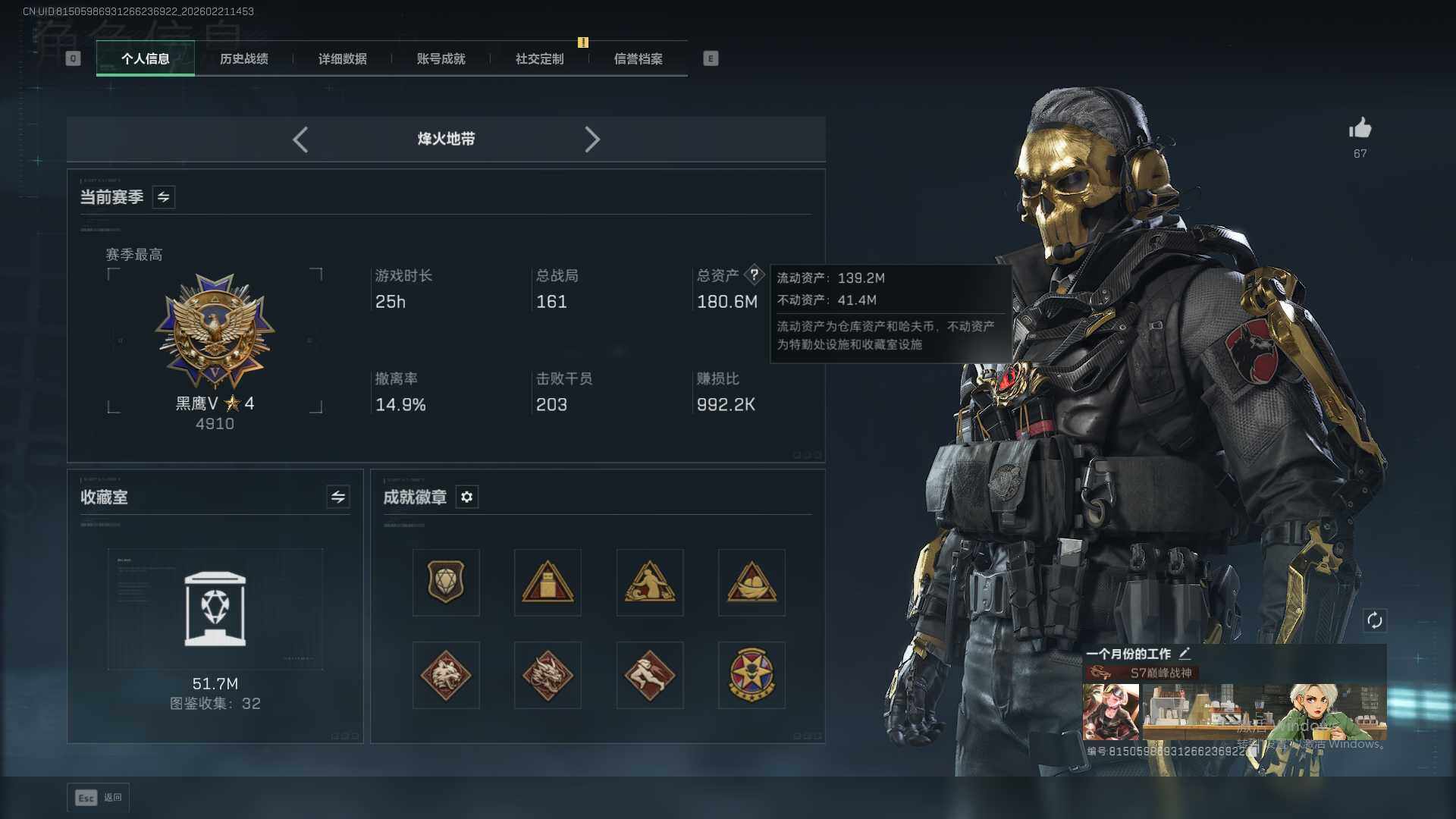 【SJ8133】总资产(M):181M/哈夫币(K):3605K/哈夫币(K):3605K/传说枪皮数:28/全面战场等级:50_段位:上等兵/烽火地带等级:60_段位:黑鹰/蚀金玫瑰/送葬人·无题密令/不破誓约/红狼-电锯惊魂/露娜-金牌射手/黑海/近战-处刑者/黑鹰/M4A1突击步枪-蚀金玫瑰/M4A1突击步枪-阿米娅/ASh-12战斗步枪-鹅鸭杀/SG552突击步枪-运动员/AK-12突击步枪-特斯拉线圈/SCAR-H战斗步枪-启航/G3战斗步枪-骑士/CAR-15突击步枪-阿米娅/腾龙突击步枪-捞点薯条/KC17突击步枪-电锯惊魂/MP5冲锋枪-黑海/UZI冲锋枪-特斯拉线圈/SMG-45冲锋枪-骑士/SR-3M紧凑突击步枪-特斯拉线圈/勇士冲锋枪-能天使-午夜邮差/QCQ171冲锋枪-鹅鸭杀/725双管霰弹枪-送葬人-无题密令/M250通用机枪-骑士之心/QJB201轻机枪-黑海/QJB201轻机枪-鹅鸭杀/M14射手步枪-蛮荒/M14射手步枪-缄花/SKS射手步枪-骑士/SR-25射手步枪-缄花/AWM狙击步枪-捞点薯条/.357左轮-缄花/93R-捞点薯条/复合弓-黑·天际线/M4A1突击步枪-竞技风/AKM突击步枪-林中猎手/QBZ95-1突击步枪-曙光/ASh-12战斗步枪-无极限/K416突击步枪-冬日风情/M16A4突击步枪-竞赛选手/AUG突击步枪-蝮蛇/M7战斗步枪-百步穿杨/SG552突击步枪-深海恐惧/SG552突击步枪-哈夫克警备/SCAR-H战斗步枪-囚徒/G3战斗步枪-流沙送葬/G3战斗步枪-哈夫克警备/AS Val突击步枪-典狱官/AS Val突击步枪-百步穿杨/腾龙突击步枪-无垢/腾龙突击步枪-猎鳄行动/K437突击步枪-守护者/MP5冲锋枪-深海恐惧/MP5冲锋枪-战术竞备/MP5冲锋枪-竞技风/Vector冲锋枪-猎鳄行动/Vector冲锋枪-百步穿杨/Vector冲锋枪-异域战争/SR-3M紧凑突击步枪-荒野求生/SR-3M紧凑突击步枪-战术竞备/勇士冲锋枪-深海恐惧/勇士冲锋枪-工业狂潮/MP7冲锋枪-无垢/MP7冲锋枪-守护者/M1014霰弹枪-林中猎手/S12K霰弹枪-曙光/PKM通用机枪-蝮蛇/PKM通用机枪-荒野求生/PKM通用机枪-阿萨拉特攻/M249轻机枪-丛影谍踪/M250通用机枪-囚徒/QJB201轻机枪-炽焰/Mini-14射手步枪-守护者/VSS射手步枪-丛影谍踪/SVD狙击步枪-阿萨拉工艺/SVD狙击步枪-暗夜猎手/SVD狙击步枪-荒野求生/M14射手步枪-工业狂潮/PSG-1射手步枪-无垢/SV-98狙击步枪-林中猎手/SV-98狙击步枪-囚徒/SV-98狙击步枪-猎鳄行动/R93狙击步枪-竞赛选手/M700狙击步枪-竞技风/M700狙击步枪-蝮蛇/M700狙击步枪-百步穿杨/M700狙击步枪-哈夫克警备/AWM狙击步枪-无极限/AWM狙击步枪-流沙送葬/复合弓-守护者/M1014霰弹枪-银灰金属/G18-银灰金属/野牛冲锋枪-黑潮/M14射手步枪-巨兽/M4A1突击步枪-繁盛/AKM突击步枪-前沿科技/AKM突击步枪-战术演练/AKM突击步枪-肃杀/QBZ95-1突击步枪-精准打击/QBZ95-1突击步枪-公平竞技/AKS-74U突击步枪-前沿科技/ASh-12战斗步枪-繁盛/K416突击步枪-前沿科技/K416突击步枪-虎啸/K416突击步枪-一帆风顺/M16A4突击步枪-街头涂鸦/AUG突击步枪-全金属外壳/M7战斗步枪-捣蛋鬼/SG552突击步枪-2026/SG552突击步枪-马年新春/SG552突击步枪-贴花艺术/AK-12突击步枪-前沿科技/SCAR-H战斗步枪-童趣/SCAR-H战斗步枪-荣耀列队/SCAR-H战斗步枪-黄昏/G3战斗步枪-战术演练/G3战斗步枪-主宰/PTR32突击步枪-前沿科技/PTR-32突击步枪-天网/CAR-15突击步枪-亚特兰蒂斯/CAR-15突击步枪-前沿科技/CAR-15突击步枪-来财/AS Val突击步枪-哈夫克科技/AS Val突击步枪-前沿科技/腾龙突击步枪-雪崩/腾龙突击步枪-前沿科技/腾龙突击步枪-冰天雪地/K437突击步枪-天狼星/MP5冲锋枪-弄臣/MP5冲锋枪-虎啸/MP5冲锋枪-哈夫克卫队/P90冲锋枪-医疗协议/P90冲锋枪-开拓/P90冲锋枪-浅鲨小队/P90冲锋枪-新生/P90冲锋枪-黄昏/P90冲锋枪-捣蛋鬼/Vector冲锋枪-先锋/Vector冲锋枪-前沿科技/UZI冲锋枪-前沿科技/UZI冲锋枪-亚特兰蒂斯/野牛冲锋枪-前沿科技/SMG-45-行动开启/SMG-45冲锋枪-幻影结构/SMG-45冲锋枪-天网/SR-3M紧凑突击步枪-雪崩/SR-3M紧凑突击步枪-马年新春/勇士冲锋枪-主宰/勇士冲锋枪-冰天雪地/MP7冲锋枪-幻影结构/M1014霰弹枪-幻影结构/M1014霰弹枪-童趣/S12K霰弹枪-战术演练/M249轻机枪-战损/M249轻机枪-冰天雪地/M250通用机枪-前沿科技/M250通用机枪-虎啸/M250通用机枪-天网/QJB201轻机枪-黄昏/QJB201轻机枪-哈夫克卫队/Mini-14射手步枪-荣耀列队/VSS射手步枪-童趣/M14射手步枪-出厂配置/SKS射手步枪-弄臣/SKS射手步枪-雪崩/SR-25射手步枪-开拓/SR-9射手步枪-街头涂鸦/PSG-1射手步枪-主宰/SV-98狙击步枪-星链科技/SV-98狙击步枪-哈夫克航天/SV-98狙击步枪-精英联盟/G18-星链科技/G18-哈夫克航天/M4A1突击步枪-雪地迷彩/QBZ95-1突击步枪-水墨迷彩/G3战斗步枪-水墨迷彩/MP5冲锋枪-蛇纹涂装/UZI冲锋枪-蛇纹涂装/PKM通用机枪-黄铜/M870霰弹枪-马赛克涂装/SV-98狙击步枪-马赛克涂装/CAR-15突击步枪-监察/MP5冲锋枪-监察/R93狙击步枪-监察/K437突击步枪-凶兽/R93狙击步枪-凶兽/AS Val突击步枪-猛兽/M1014霰弹枪-旧工业/腾龙突击步枪-古铜/PTR-32突击步枪-噬菌体/M4A1突击步枪-粉色涂装/M4A1突击步枪-高雅黑/M4A1突击步枪-海色/AKM突击步枪-彩墨喷涂/QBZ95-1突击步枪-粉色涂装/QBZ95-1突击步枪-高雅黑/QBZ95-1突击步枪-海浪/QBZ95-1突击步枪-三角洲力量/QBZ95-1突击步枪-海色/QBZ95-1突击步枪-2026/QBZ191突击步枪-三角洲力量/K416突击步枪-几何迷彩/K416突击步枪-高雅黑/K416突击步枪-重击/M16A4突击步枪-山林猎人/M16A4突击步枪-高雅黑/M16A4突击步枪-星链坠落/AUG突击步枪-浅蓝涂装/M7战斗步枪-红色涂装/SG552突击步枪-浅蓝涂装/SG552突击步枪-海浪/SG552突击步枪-彩墨喷涂/AK-12突击步枪-落花/AK-12突击步枪-变色