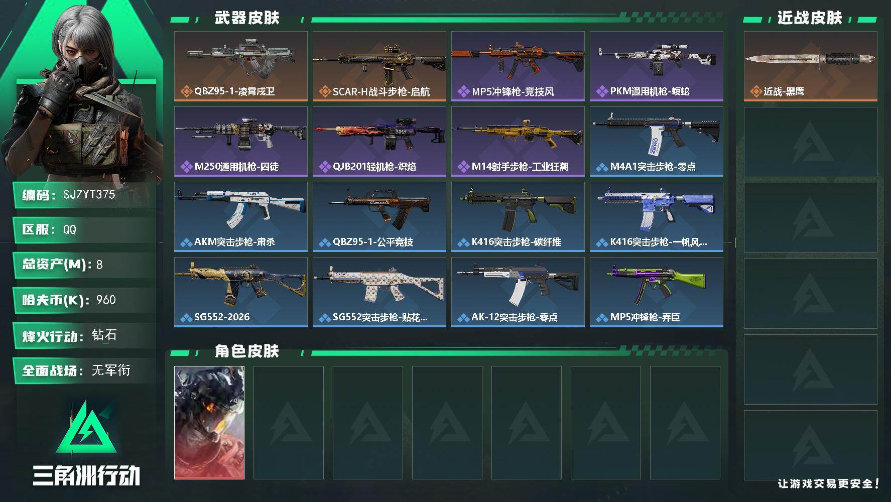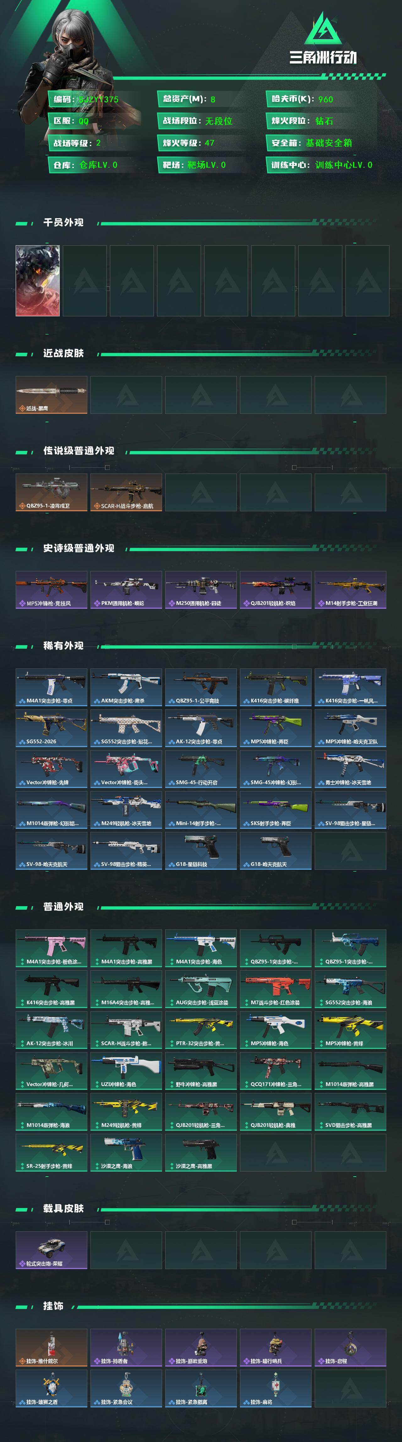 【SJZYT375】总资产(M):8M/哈夫币(K):960K/哈夫币(K):960K/传说枪皮数:2/全面战场等级:2_段位:无段位/烽火地带等级:47_段位:钻石/威龙-凌霄戍卫/黑鹰/QBZ95-1突击步枪-凌霄戍卫/SCAR-H战斗步枪-启航/MP5冲锋枪-竞技风/PKM通用机枪-蝮蛇/M250通用机枪-囚徒/QJB201轻机枪-炽焰/M14射手步枪-工业狂潮/M4A1突击步枪-零点/AKM突击步枪-肃杀/QBZ95-1突击步枪-公平竞技/K416突击步枪-碳纤维/K416突击步枪-一帆风顺/SG552突击步枪-2026/SG552突击步枪-贴花艺术/AK-12突击步枪-零点/MP5冲锋枪-弄臣/MP5冲锋枪-哈夫克卫队/Vector冲锋枪-先锋/Vector冲锋枪-街头涂鸦/SMG-45-行动开启/SMG-45冲锋枪-幻影结构/勇士冲锋枪-冰天雪地/M1014霰弹枪-幻影结构/M249轻机枪-冰天雪地/Mini-14射手步枪-荣耀列队/SKS射手步枪-弄臣/SV-98狙击步枪-星链科技/SV-98狙击步枪-哈夫克航天/SV-98狙击步枪-精英联盟/G18-星链科技/G18-哈夫克航天/M4A1突击步枪-粉色涂装/M4A1突击步枪-高雅黑/M4A1突击步枪-海色/QBZ95-1突击步枪-高雅黑/QBZ95-1突击步枪-海浪/QBZ95-1突击步枪-2026/K416突击步枪-高雅黑/M16A4突击步枪-高雅黑/AUG突击步枪-浅蓝涂装/M7战斗步枪-红色涂装/SG552突击步枪-海浪/AK-12突击步枪-冰川/SCAR-H战斗步枪-数码迷彩/PTR-32突击步枪-黄蜂/MP5冲锋枪-海色/MP5冲锋枪-黄蜂/Vector冲锋枪-几何迷彩/UZI冲锋枪-海色/野牛冲锋枪-高雅黑/QCQ171冲锋枪-三角洲力量/M1014霰弹枪-高雅黑/M1014霰弹枪-海浪/M249轻机枪-黄蜂/QJB201轻机枪-三角洲力量/QJB201轻机枪-典雅/SVD狙击步枪-高雅黑/SR-25射手步枪-黄蜂/沙漠之鹰-海浪/沙漠之鹰-高雅黑/G17-2026/轮式突击炮-荣耀/挂饰-维什戴尔/挂饰-持盾者/挂饰-崩岩重炮/挂饰-暗行哨兵/挂饰-启程/挂饰-雄狮之盾/挂饰-紧急会议/挂饰-紧急撤离/挂饰-麻将