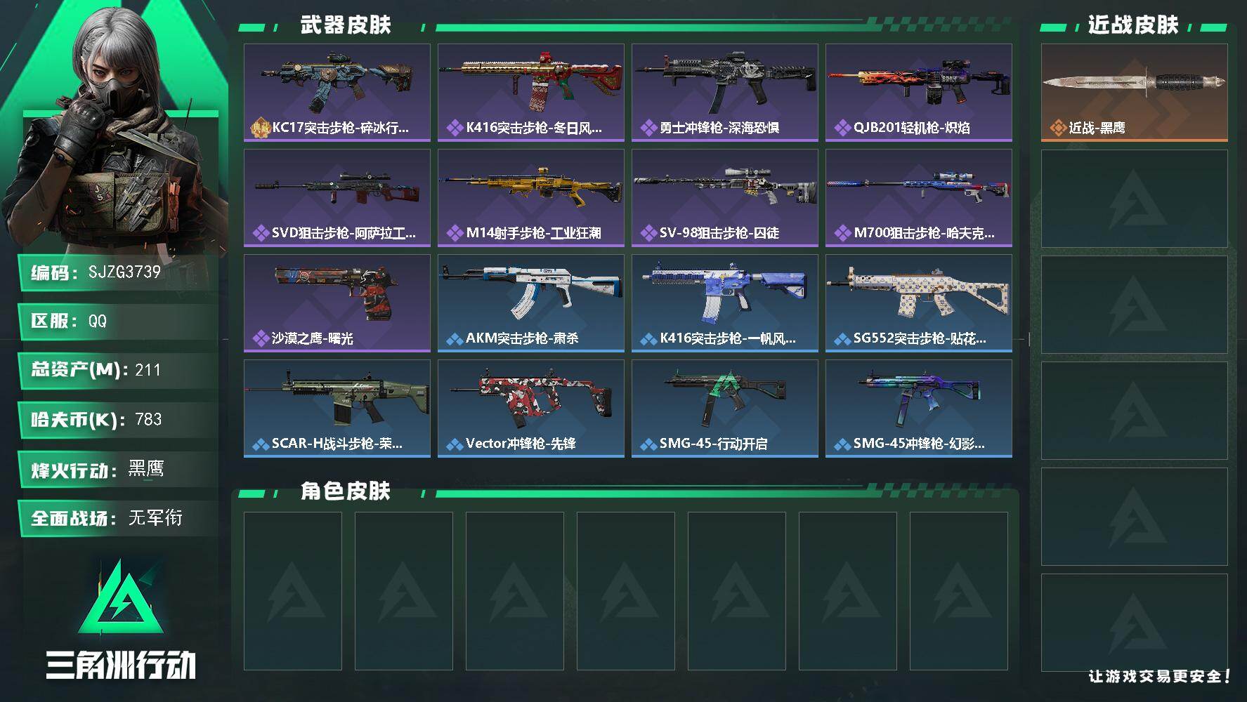 【SJZG3739】总资产(M):211M/哈夫币(K):783K/哈夫币(K):783K/全面战场等级:1_段位:无段位/烽火地带等级:60_段位:黑鹰/黑鹰/KC17突击步枪-碎冰行动/K416突击步枪-冬日风情/勇士冲锋枪深海恐惧/QJB201轻机枪-炽焰/SVD狙击步枪-阿萨拉工艺/M14射手步枪-工业狂潮/SV-98狙击步枪-囚徒/M700狙击步枪-哈夫克警备/沙漠之鹰-曙光/AKM突击步枪-肃杀/K416突击步枪-一帆风顺/SG552突击步枪-贴花艺术/SCAR-H战斗步枪-荣耀列队/Vector冲锋枪-先锋/SMG-45-行动开启/SMG-45冲锋枪-幻影结构/勇士冲锋枪-冰天雪地/M1014霰弹枪-幻影结构/M249轻机枪-冰天雪地/QJB201轻机枪-哈夫克卫队/Mini-14射手步枪-荣耀列队/SV-98狙击步枪-星链科技/SV-98狙击步枪-哈夫克航天/SV-98狙击步枪-精英联盟/G18-星链科技/G18-哈夫克航天/M870霰弹枪-马赛克涂装/勇士冲锋枪-噬菌体/SMG-45冲锋枪-斑马/M4A1突击步枪-粉色涂装/M4A1突击步枪-高雅黑/M4A1突击步枪-海色/QBZ95-1突击步枪-高雅黑/QBZ95-1突击步枪-2026/K416突击步枪-几何迷彩/K416突击步枪-高雅黑/M16A4突击步枪-高雅黑/AUG突击步枪-浅蓝涂装/SG552突击步枪-浅蓝涂装/SG552突击步枪-海浪/SCAR-H战斗步枪-数码迷彩/G3战斗步枪-高雅黑/PTR-32突击步枪-黄蜂/MP5冲锋枪-黄蜂/Vector冲锋枪-几何迷彩/野牛冲锋枪-高雅黑/M1014霰弹枪-高雅黑/M1014霰弹枪-海浪/M1014霰弹枪-重击/M249轻机枪-黄蜂/QJB201轻机枪-典雅/SVD狙击步枪-高雅黑/SR-25射手步枪-黄蜂/SV-98狙击步枪-红色涂装/沙漠之鹰-海浪/沙漠之鹰-高雅黑/G17-2026/挂饰-崩岩重炮/挂饰-暗行哨兵/挂饰-聚宝盆/挂饰-紧急撤离/挂饰-麻将
