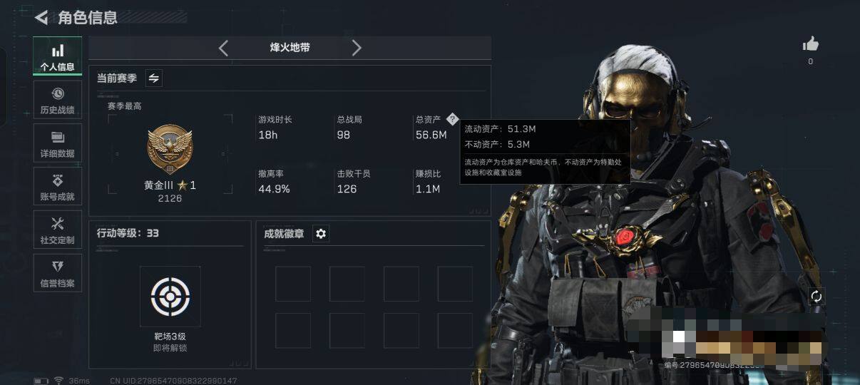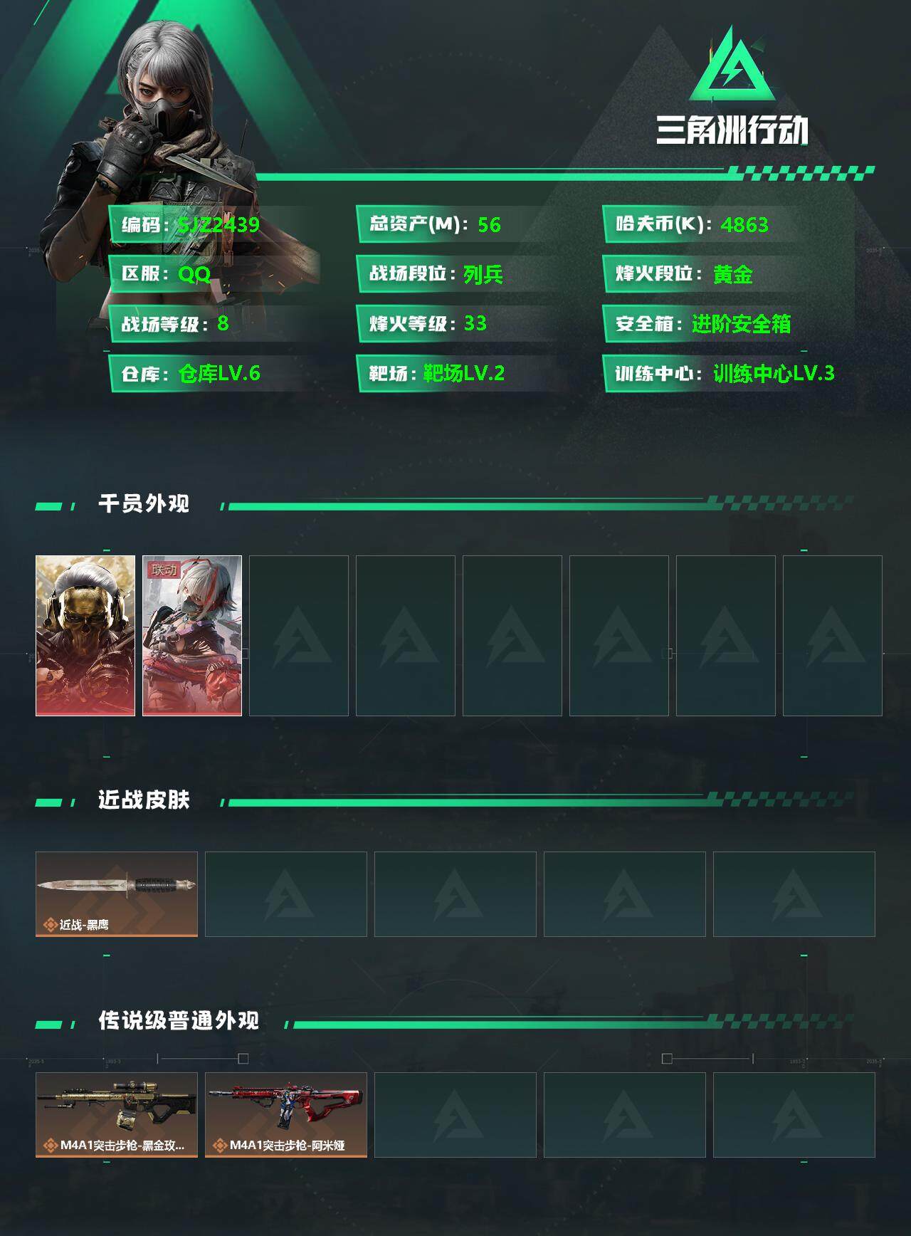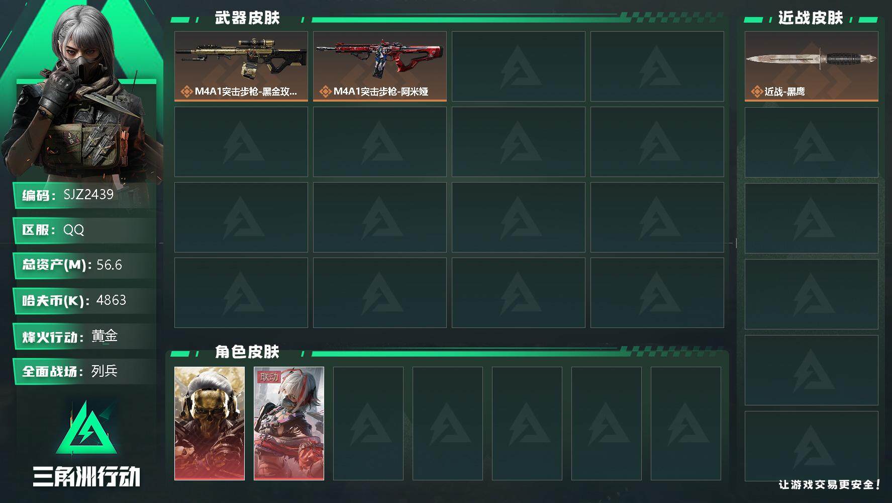 【SJZ2439】总资产(M):56.6M/哈夫币(K):4863K/哈夫币(K):4863K/传说枪皮数:6/全面战场等级:8_段位:列兵/烽火地带等级:33_段位:黄金/红狼-蚀金玫瑰/骇爪-维什戴尔/黑鹰/M4A1突击步枪-阿米娅/M4A1突击步枪-蚀金玫瑰