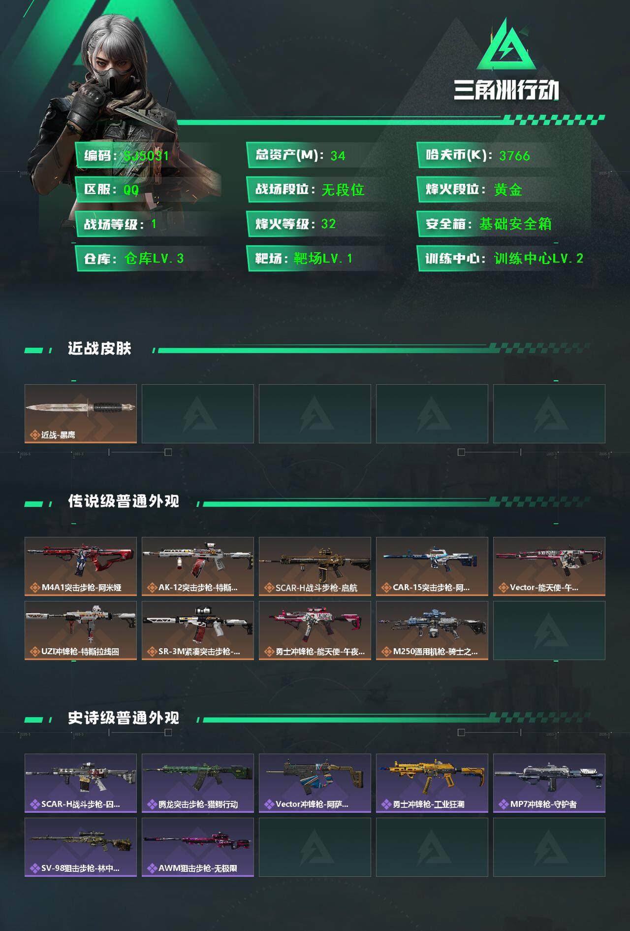 【SJ5031】总资产(M):34M/哈夫币(K):3766K/哈夫币(K):3766K/全面战场等级:1_段位:无段位/烽火地带等级:32_段位:黄金/黑鹰/M4A1突击步枪-阿米娅/AK-12突击步枪-特斯拉线圈/SCAR-H战斗步枪-启航/CAR-15突击步枪-阿米娅/Vector冲锋枪-能天使-午夜邮差/UZI冲锋枪-特斯拉线圈/SR-3M紧凑突击步枪-特斯拉线圈/勇士冲锋枪-能天使-午夜邮差/M250通用机枪-骑士之心/SCAR-H战斗步枪-囚徒/腾龙突击步枪-猎鳄行动/Vector冲锋枪-阿萨拉文明/勇士冲锋枪-工业狂潮/MP7冲锋枪-守护者/SV-98狙击步枪-林中猎手/AWM狙击步枪-无极限/M4A1突击步枪-零点/K416突击步枪-碳纤维/AK-12突击步枪-零点/SCAR-H战斗步枪-荣耀列队/SMG-45-行动开启/M1014霰弹枪-幻影结构/Mini-14射手步枪-荣耀列队/SVD狙击步枪-战术行动/M4A1突击步枪-粉色涂装/M4A1突击步枪-高雅黑/M4A1突击步枪-海色/QBZ95-1突击步枪-海浪/QBZ95-1突击步枪-海色/QBZ191突击步枪-三角洲力量/K416突击步枪-高雅黑/M16A4突击步枪-山林猎人/AUG突击步枪-浅蓝涂装/M7战斗步枪-红色涂装/SG552突击步枪-海浪/SCAR-H战斗步枪-数码迷彩/G3战斗步枪-高雅黑/PTR-32突击步枪-黄蜂/MP5冲锋枪-海色/MP5冲锋枪-黄蜂/UZI冲锋枪-海色/M1014霰弹枪-高雅黑/M249轻机枪-黄蜂/QJB201轻机枪-三角洲力量/SR-25射手步枪-黄蜂/沙漠之鹰-海浪/军牌-特斯拉线圈/军牌-来点薯条/军牌-修整/军牌-信誉优秀/军牌-小心鳄鱼/幸运鼠鼠/挂饰-阿萨拉机枪兵/挂饰-阿萨拉喷火兵/挂饰-能天使/挂饰-阿萨拉狙击兵/挂饰-诡影狙击兵/挂饰-诡影喷火兵/挂饰-崩岩重炮/挂饰-特斯拉线圈/挂饰-启程